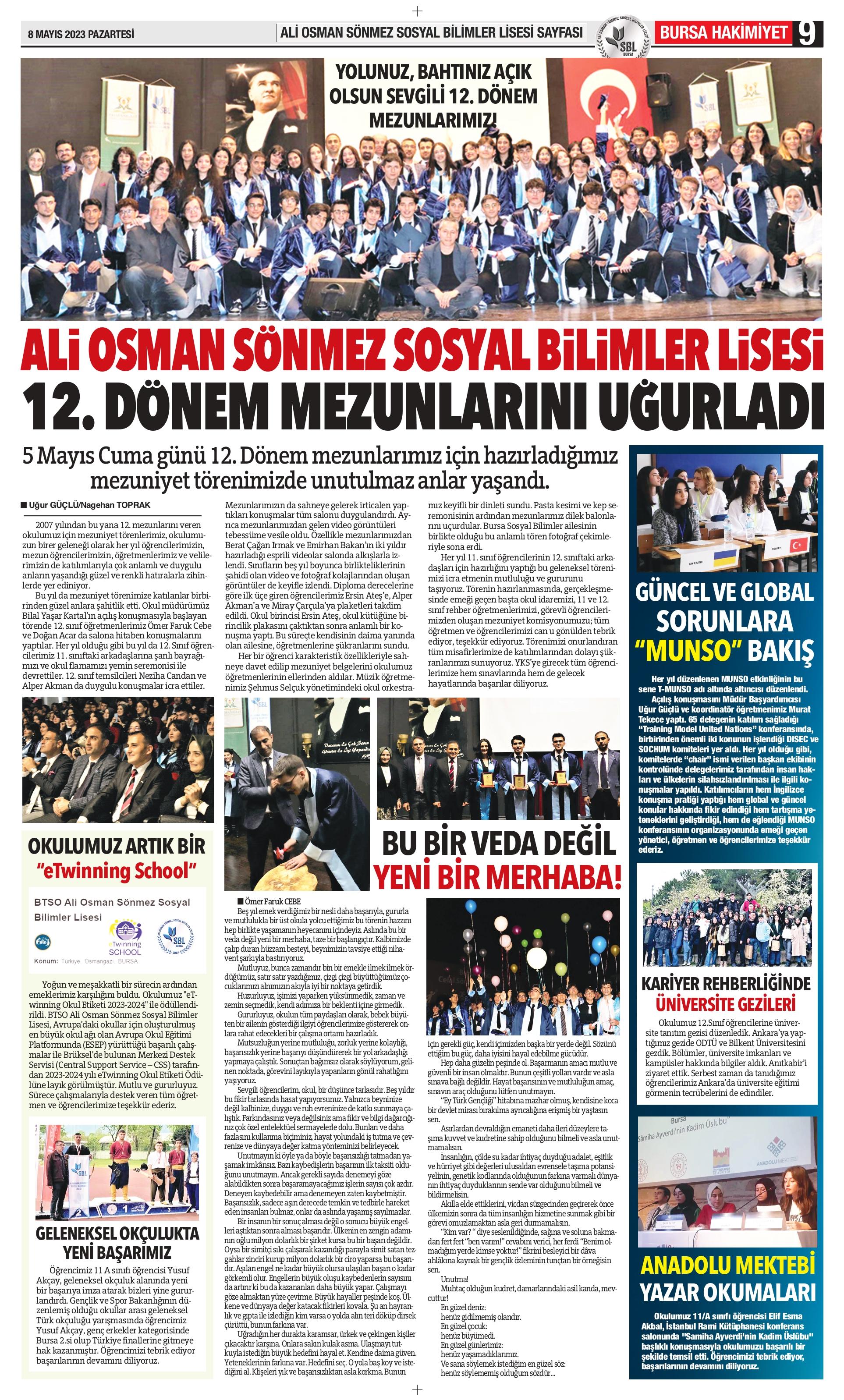 Bursa Hakimiyet Gazetesinde yayınlanan sayfalarımız ve okulumuzun basında çıkan dosyaları.